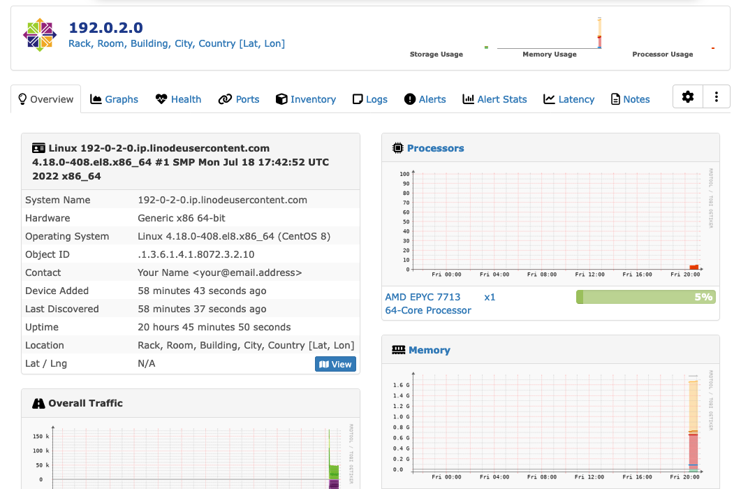 The tabs provide you with a range of areas to review the device on. Having set up the LibreNMS check_mk