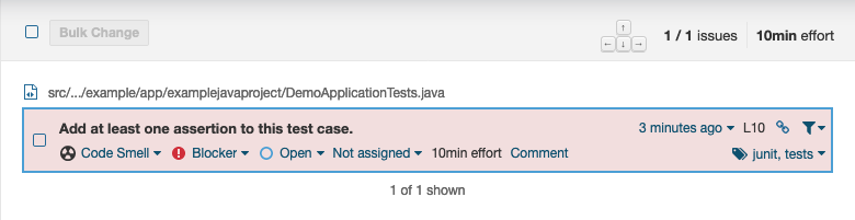 SonarQube found that a test case within the project does not have any assertions, which it flags as an error. You can use this interface to manage the error, redefining it, for instance, or giving this instance a pass, or closing the issue as resolved.